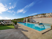3 rom leilighet 65 m2 i 2nd etasje. Stue/spisestue med, 1 sovesoffa, satelit-TV og air-conditioning. Utgang til terrassen. 1 rom med, 1 dobbeltseng (2 x 90 cm, lengde 200 cm). 1 rom med 1 seng (90 cm lengde 200 cm), 1 dobbeltseng (2 x 90 cm, lengde 200 cm). Kjøkkenkrok (4 kokeplater). Dusj/WC. Terrasse 12 m2, beliggenhet mot sør. Terrassemøbler. Vakker panoramautsikt av havet og landskapet. Fasiliteter: strykejern, hårføner. Internett (trådløs LAN [WLAN], gratis). Overrasket med en fantastisk utsikt over havet. Egnet for grilling. Det er et basseng. Et trådløst LAN (trådløst lokalnettverk) er tilgjengelig.- fasiliteter
