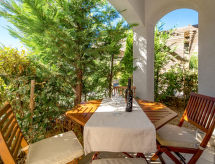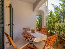 "Pavica 2", 2 rom leilighet 35 m2, på bakkeplan. Moderne og koseligt møbler: stue/spisestue 18 m2 med, 1 dobbel sovesoffa, satelit-TV og air-conditioning. Utgang til terrassen. 1 rom med, 1 dobbeltseng (160 cm, lengde 200 cm). Åpent kjøkken (4 kokeplater, mikrobølgeovn, frys). Dusj/WC. Liten terrasse 5 m2, dekt. Terrassemøbler. Fasiliteter: safe. Internett (trådløs LAN [WLAN], gratis). Parkeringsplass. Med inngjerdet tomt. Den har en terrasse. En overbygd parkering er tilgjengelig. Det har et oppvarmet basseng. Et barnebasseng er tilgjengelig.- fasiliteter