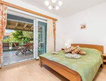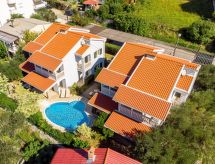 "Petra 2", 2 rom leilighet 36 m2, på bakkeplan. Moderne og koseligt møbler: stue/spisestue 18 m2 med, 1 dobbel sovesoffa (145 cm, lengde 195 cm), satelit-TV og air-conditioning. Utgang til terrassen. 1 rom med, 1 dobbeltseng (160 cm, lengde 200 cm). Utgang til terrassen. Åpent kjøkken (4 kokeplater, mikrobølgeovn, frys). Dusj/WC. Terrasse 20 m2, dekt. Terrassemøbler. Utsikt av svømmebassenget. Fasiliteter: safe. Internett (trådløs LAN [WLAN], gratis). Parkeringsplass. Klimaanlegget sørger for god romtemperatur. Fordi den følelsesvennlige faktoren spiller en viktig rolle og er viktig for oss. Det er en terrasse. En overbygd parkering er tilgjengelig. Den har et basseng. Huset er også utstyrt med et oppvarmet basseng.- fasiliteter