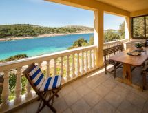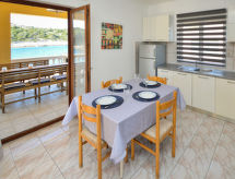 Uvala Mikavica: Enmannsbolig "Petra", med 2 etasjer. 3 km fra sentrum av Žirje, i en roligt, solrikt posisjon, direkte ved havet, direkte ved stranden. Privat: tomt 400 m2. Grill. I hbrukt: internetilkobbling. Tilgang med bil hele veien til hbrukt (30 m naturvei). Parkering (for 2 biler) ved hbrukt på tomten. Butikk 4 km, restaurant 600 m, ferje 4 km, småstenstrand, strand ved klipper 10 m. Turstier fra hbrukt 200 m, sykkelvei 250 m. Kranen har ingen drikkevannskvalitet. Regnvann (sisterne). Bakkeplan er avstengt og brukes ikke.Interior