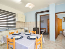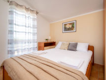4 rom hus 80 m2 på 2 etasjer, beliggenhet mot vest. 2 rom, hvert rom med, 1 dobbeltseng (160 cm, lengde 200 cm). Spisestue med, TV (flatskjerms TV), air-conditioning. Utgang til terrassen. Åpent kjøkken (4 kokeplater, stekeovn, frys). Bad/WC. Toppetasje: (utendørs trapp) spisestue med skråtak, Lav dørhøyde 175 cm 270 cm med, air-conditioning. Utgang til terrassen. 1 rom med skråtak Lav dørhøyde 190 cm 270 cm med, 1 dobbeltseng (140 cm, lengde 200 cm). Utgang til balkongen. 1 rom med skråtak Lav dørhøyde 190 cm 270 cm med 2 senger (90 cm lengde 200 cm). Utgang til balkongen. Bad/WC. 2 balkonger 3 m2, terrasse 20 m2, dekt, terrasse 20 m2. Terrassemøbler. Hærlig utsikt av havet. Fasiliteter: Internett (trådløs LAN [WLAN], gratis). Kjæledyr / hund tillatt 1 kjæledyr / hund tillatt. Et badekar er tilgjengelig. Skal den kjære hunden bli plassert i et dyreslag i ferien? Nei, de firebenede vennene tilhører familien, og uten ham er en perfekt ferie praktisk talt utenkelig og derfor velkommen her. En terrasse er tilgjengelig. Den har et trådløst lokalnettverk (WLAN).- fasiliteter