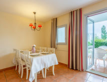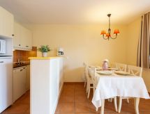 3 rom leilighet 43 m2, på bakkeplan. Vakkert møbler: stue/spisestue med, 1 uttrekkbar seng (2 pers. 2 x 80 cm, lengde 190 cm), TV (flatskjerms TV). Utgang til terrassen. 1 rom med, 1 dobbeltseng (140 cm, lengde 190 cm). 1 rom med, 1 x 2 køysenger (80 cm, lengde 190 cm). Kjøkkenkrok (oppvaskmaskin, 4 keramiske kokeplater, vannkoker, frys, grill, elektrisk kaffemaskin, kombinert mikrobølgeovn). Bad, dusj/WC. El-oppvarming. Terrasse 11 m2, beliggenhet mot sør og beliggenhet mot vest. Terrassemøbler, liggestoler. Utsikt av svømmebassenget. Fasiliteter: strykejern, hårføner. Internett (trådløs LAN [WLAN], gratis). Parkeringsplass plass nr 133 (overdekt, 1 Bil). Vennligst merk: røykvarsler. 64038000149F4 Residence. Det er en oppvaskmaskin. Huset er også utstyrt med en overbygd parkeringsplass. Den har et barnebasseng. Et bordtennisbord er tilgjengelig.- Kjennetegn ved boligen