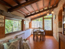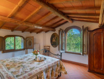 Stor, familievennlig, komfortabel herregård "Poggio Cuccule", 350 m.o.h. Omgitt av trær. 7 km fra sentrum av Montevarchi, Montegonzi, 50 km fra sentrum av Firenze, 45 km fra sentrum av Siena, i en roligt, solrikt, høyt posisjon, i det grønne. Privat: tomt 7'000 m2 (inngjerdet), naturlig hage 3'000 m2 (inngjerdet), svømmebasseng (6 x 12 m, dybde 90- 190 cm dyp, Sesongåpent: 24.Apr. - 08.Okt.). Bordtennis, hagemøbler, grill, grillplass. I hbrukt: internetilkobbling, biljard, vaskemaskin, oppvarming betales lokalt (01.11. - 15.04.), oppvarming kun tilgjengelig fra 01.11. til 15.04.. Sengetøyskift 1 ukentlig. Romrengjøring på forespørsel (ekstra). Bratt Tilgang med bil hele veien (200 m naturvei). Parkering på tomten. Butikk 5 km, daglivarehandel 3 km, bussholdeplass 800 m, togstasjon "Montevarchi" 5 km. Golfbane 50 km, tennis 5 km, rideskole 3 km. Attraksjoner i nærheten: Moto Cross Circuit Miravalle 1 km. Vennligst merk: bil anbefales. Velegnet for barnefamilier. Eieren godtar ikke noen ungdomsgrupper. Lovely stone house built at the end of 18th century situated in a wonderful setting, 350 m above sea level, surrounded by olive groves, vineyards and forests in a nice panoramic position. It is in an ideal location for visits to the most important towns of the area like Cortona, Pienza, Montalcino, S Gimignano and the Chianti region. The main house (sleeps 10) and the 2 outbuildings opposite it ( each sleeps 6) are rented together (sleeps 22), in total 430 m2. For bookings in a low and mid season for a main house and one outbuilding 10% discount available (ask at the time of booking). Wood burning oven, organic fruits and vegetables. It's possible to buy local olive oil and wine on site. Free logs. It's possible to organize dinners on request at 25 euros per child and 40 euros per adult. On request it is possible to arrange cookery courses and tasting of typical Tuscan wines (extra). Next to the house there is a small oak wood with children bowling area ( 2 x 9 m). Outdoor area for enjoying meals al fresco, 40 m2, next to the manor house. Det perfekte reisemål for en golfferie. Montegonzi tilbyr de beste forholdene for golf. På steder hvor grøntvoktere opprettholder frodige greener og mynte fairways. Hvis du er ute etter lykken på denne jorden på baksiden av hestene, er du på rett sted her. Kjør på de mange idylliske ridestiene på lokale gårder.Interior
