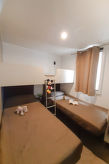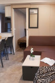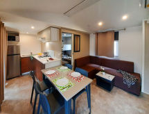 "Ponente Deluxe", 3 rom bungalow 29 m2. Praktiskt møbler: stue/soverom med, 1 sovesoffa og spisebord. Utgang til terrassen. 1 rom med, 1 dobbeltseng (160 cm). 1 rom med 3 senger (70 cm lengde 185 cm). Åpent kjøkken (4 gassbrennere, mikrobølgeovn, frys). Dusj/bidé/WC. Oppvarming, airconditioning. Terrasse 15 m2. Terrassemøbler. Fasiliteter: myggnett, høy barnestol. Eiendommen tilhører en type eiendom eller leilighet. Informasjon om området Bibbona er tilgjengelig i resepsjonen. En restaurant drives i umiddelbar nærhet. Halvpensjon er en del av en helt bekymringsfri ferie. På forespørsel er det mulig å bestille frokost. Med inngjerdet tomt. En tilknyttet idyllisk hage inviterer deg til å ligge i solen. Huset er også utstyrt med et barnebasseng. Det er en tørketrommel.- fasiliteter