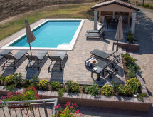 4 rom hus 110 m2 på 2 etasjer. Stue/spisestue 45 m2 med, satelit-TV (flatskjerms TV), air-conditioning. Utgang til terrassen, til badebassenget. Åpent kjøkken (stekeovn, oppvaskmaskin, 4 keramiske kokeplater, vannkoker, mikrobølgeovn, frys, elektrisk kaffemaskin). Sep. WC. øverste etasje: 1 rom med, 1 dobbeltseng (2 x 100 cm, lengde 200 cm), dusj/WC og satelit-TV (flatskjerms TV), air-conditioning. 1 rom med, 1 dobbeltseng (160 cm, lengde 200 cm), dusj/WC og satelit-TV (flatskjerms TV), air-conditioning. 1 stort rom med, 1 dobbeltseng (2 x 100 cm, lengde 200 cm), dusj/WC og satelit-TV (flatskjerms TV), air-conditioning. Utgang til terrassen. Varmluftsoppvarming (ekstra). Terrasse 50 m2 delvis dekt, terrasse 15 m2. Terrassemøbler, elektrisk grill (flyttbar), liggestoler. Utsikt av svømmebassenget og landskapet. Fasiliteter: safe, barneseng, hårføner. Internett (trådløs LAN [WLAN], gratis). Egnet for grilling. Det er et privat basseng.- fasiliteter
