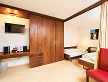 Residens "Ringstrasse (Utoring)". I området, 500 m fra sentrum, 20 m fra skiområdet. I hbrukt: bar, oppholdsrom, bordtennis, lekerom, heis, sykkelrom, skirom, sentralvarme, vaskemaskin, tørketrommel (ekstra). Rundstykkeservice og drikkevareservis. Tilgang med bil hele veien til hbrukt (fjellvei). Kjettinger nødvendige på vinteren, firhjulsdrift på bil anbefales. Parkering ved hbrukt, offentlig parkeringshus på 50 m, ekstra. Daglivarehandel, supermarked, restaurant, utendørs svømmebasseng 500 m, termalbad 300 m. Tennis 500 m, kabelbane, skisportenanlegg, skibakker 20 m, akebane, langrensløype 500 m, skøytebane 1 km. Velkjente skiområder: Leukerbad Torrent. Turstier Gemmi 1 km. The house is situated on a wooded southerly slope, directly next to the Torrenthorn cable lift. Only a short flight of stairs separates the house from the valley station. Parking in winter 35 SFR/week. Garage 70 SFR/week. Parking is free in summer, garage 35 SFR/week. Cleaning and linen payable locally for stays under 6 nights. Linen 21 SFR per person. Cleaning: studio 60 SFR to 70 SFR, 2 room apartment 85 SFr to 90 Sfr, 3 room apartment 115 SFR. Fancy fjellturer? Du er på rett sted for det. Bare sett på turskoene dine og begynn å gå. Ikke glem å gå på tur og vandre støvler! Området er flatt og er ideelt for en dagstur til fots. I regionen Leukerbad er det en skøytebane, hvor du kan nyte turen på skidene. Tallrike kilometer med løyper er tilgjengelig for snowboardåkere å bevise seg i bakken. Turgåing løypene tilbyr massevis av akingkjøring i flere dager på stedet. Her finner du din tennisspiller for neste tenniskamp. Steder er tilgjengelige.Interior
