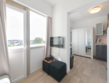 "Sea & Serenity", 1 rom etromsleilighet 18 m2 i 6th etasje. Passer for 2 voksne. Renovert i 2020, praktiskt og moderne møbler: Studio med, 1 dobbel sovesoffa (140 cm, lengde 200 cm), digital TV og flatskjerms TV. Lite, åpent kjøkken (2 induksjonskomfyr, brødrister, vannkoker, mikrobølgeovn, elektrisk kaffemaskin). Dusj/WC. El-oppvarming. Liten terrasse. Terrassemøbler. Vakker panoramautsikt av landskapet. Fasiliteter: Internett (trådløs LAN [WLAN], gratis). Vennligst merk: røykfritt hus. Røykvarsler, brannslukkningsapparat. Eiendommen er helt inngjerdet. På lekeplassen kan barna la av damp.- fasiliteter