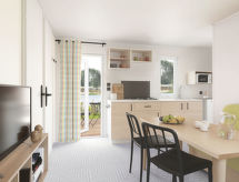 "4 persoons", 3 rom campingvogn 30 m2. Komfortabelt møbler: stue/spisestue med, spisebord og flatskjerms TV. Utgang til terrassen. 1 dobblet rom med, 1 dobbeltseng. 1 dobblet rom med 2 senger. Åpent kjøkken (4 gassbrennere, mikrobølgeovn, elektrisk kaffemaskin). Dusj, sep. WC. Oppvarming. Terrasse. Terrassemøbler. Parkeringsplass ved hbrukt. Vennligst merk: røykfritt hus. Max kjæledyr/små hunder tillatt 2 kjæledyr/små hunder tillatt. Røykvarsler. Spill for barn i alle aldre er tilgjengelig på stedet. Et innendørsbasseng er tilgjengelig. Huset er også utstyrt med et barnebasseng.- fasiliteter