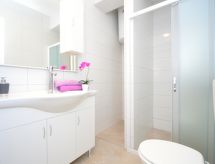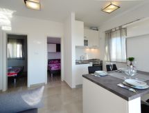 3 rom leilighet 57 m2 i 1st etasje, beliggenhet mot vest. Vakkert og moderne møbler: stue/spisestue med, 1 sovesoffa (110 cm, lengde 190 cm), satelit-TV (flatskjerms TV), air-conditioning. Utgang til terrassen. 2 rom, hvert rom med, 1 dobbeltseng (160 cm, lengde 200 cm). Åpent kjøkken (4 kokeplater, ovn, oppvaskmaskin, vannkoker, mikrobølgeovn, frys, elektrisk kaffemaskin). Dusj/bidé/WC. Terrasse 12 m2, dekt. Terrassemøbler. God utsikt av havet. Fasiliteter: vaskemaskin, hårføner. Internett (trådløs LAN [WLAN], gratis). Parkeringsplass (inngjerdet). Med inngjerdet tomt. Den har et trådløst lokalnettverk (WLAN). En mikrobølgeovn er også tilgjengelig. En ovn er tilgjengelig.- fasiliteter