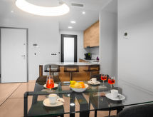 "Sunset waves", 3 rom leilighet 88 m2. Passer for 4 voksne. Romlig og lys, komfortabelt og smakfullt møbler: stue/spisestue med, digital TV og air-conditioning. 1 rom med 2 senger (90 cm lengde 190 cm), air-conditioning. 1 rom med, 1 dobbeltseng (150 cm, lengde 190 cm), dusj/WC og air-conditioning. Utgang til terrassen. Kjøkkenkrok (stekeovn, oppvaskmaskin, 3 induksjonskomfyr, brødrister, vannkoker, mikrobølgeovn, frys, elektrisk kaffemaskin). Dusj/WC. Airconditioning. Terrasse 19 m2. Terrassemøbler. Delvis utsikt av havet og området. Fasiliteter: vaskemaskin, strykejern, høy barnestol barneseng for barn opp til 2 år, hårføner. Internett (trådløs LAN [WLAN], gratis). Parkeringsplass plass nr 61. VT-323699-BM En terrasse er tilgjengelig. En oppvaskmaskin er tilgjengelig. Huset er også utstyrt med et trådløst lokalnettverk (WLAN).- fasiliteter