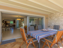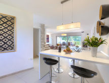 4 rom rekkehus 160 m2 på 2 etasjer. Stue/spisestue med, åpen peis, satelit-TV, DVD og air-conditioning. Utgang til terrassen. Åpent kjøkken (4 kokeplater, oppvaskmaskin, mikrobølgeovn, frys). Dusj/WC. I underetasje: sep. WC. øverste etasje: 1 rom med, 1 dobbeltseng (160 cm, lengde 200 cm), bad/bidèt/WC, med hjørnebadekar og air-conditioning. Utgang til terrassen. 1 rom med, 1 dobbeltseng (160 cm, lengde 200 cm), air-conditioning. 1 rom med 2 senger (90 cm lengde 200 cm), air-conditioning. Dusj/WC. Oppvarming (ekstra). Terrasse 20 m2, dekt, terrasse 8 m2, med tak. Terrassemøbler. Utsikt av havet. Fasiliteter: Internett (trådløs LAN [WLAN], gratis). Garasje (2 Biler). 1 lite kjæledyr / liten hund tillatt. Eiendommen er helt inngjerdet. Overrasket med en fantastisk utsikt over havet. Den undertrykkende varmen kan legge stor belastning på kropp og sinn. Derfor er lokalene utstyrt med air condition. Den har en brannpit. Et oppvarmet basseng er tilgjengelig. Det er WLAN (Wireless Local Area Network).- Kjennetegn ved boligen