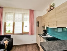 "Talboden", 2 rom leilighet 43 m2, på bakkeplan. Passer for 2 voksne + 2 barn. Romlig og lys, fullstendig renovert, komfortabelt og smakfullt møbler: inngang. 1 dobblet rom med, kabel-TV. Stue/soverom med, 1 dobbel sovesoffa, spisebord og kabel-TV. Åpent kjøkken (ovn, oppvaskmaskin, 2 keramiske kokeplater, mikrobølgeovn). Dusj/WC, dobbel servant. Stor terrasse delvis dekt, beliggenhet mot sør. Terrassemøbler, liggestoler. Meget vakker utsikt av fjellene og skibakkene. Fasiliteter: safe, hårføner. Internett (trådløs LAN [WLAN]). Vennligst merk: velegnet for familier. Røykfri bolig. Røykvarsler, brannslukkningsapparat. Et solarium er tilgjengelig og er tilgjengelig på eiendommen. Egnet for grilling. Huset er også utstyrt med oppvaskmaskin. Huset er også utstyrt med en badstue.- fasiliteter