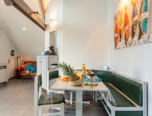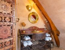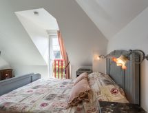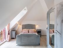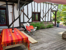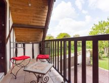"Valhalla, chez Jules", 3 rom halvpart av tomannsbolig 60 m2. Komfortabelt og vakkert møbler: øverste etasje: (utendørs trapp) stue/spisestue med skråtak med, spisehjørne og satelit-TV. Utgang til balkongen. 1 rom med skråtak med, 1 dobbeltseng (140 cm, lengde 190 cm), vaskeservant. 1 rom med skråtak med 2 senger (90 cm lengde 190 cm), vaskeservant. Utgang til balkongen. Kjøkkenkrok (ovn, oppvaskmaskin, 4 keramiske kokeplater, brødrister, vannkoker, mikrobølgeovn, frys, elektrisk kaffemaskin). Dusj/WC. Oppvarming. 2 balkonger, terrasse. Terrassemøbler, balkongmøbler grill, liggestoler (4). Vakker utsikt av hagen. Fasiliteter: vaskemaskin, safe, strykejern, høy barnestol barneseng for barn opp til 2 år, hårføner. Internett (trådløs LAN [WLAN], gratis). Vennligst merk: røykfri bolig. Røykvarsler. Den har en balkong. Passer til grill. Den har oppvaskmaskin.- fasiliteter