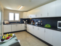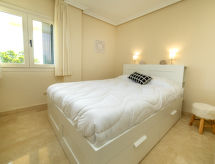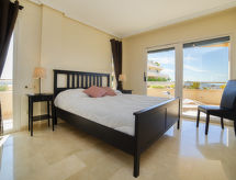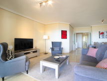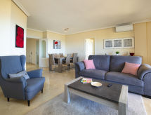"Villa Marina Golf", 4 rom leilighet 157 m2 i 6th etasje. Romlig og lys, vakkert og stilfullt møbler: åpen stor stue/spisestue med, TV, air-conditioning og varmluft oppvarming. Utgang til terrassen. 1 rom med, 1 dobbeltseng (1 x 160 cm, lengde 200 cm), dusj/WC, air-conditioning og varmluft oppvarming. 2 rom, hvert rom med, 1 dobbeltseng (1 x 160 cm, lengde 200 cm), air-conditioning og varmluft oppvarming. Stort kjøkken (stekeovn, oppvaskmaskin, mikrobølgeovn, frys, elektrisk kaffemaskin). Bad/dusj/WC. Stor terrasse. Vakker utsikt av havet og området. Fasiliteter: vaskemaskin, strykejern, høy barnestol barneseng, hårføner. Internett (trådløs LAN [WLAN], gratis). Parkeringsplass (overdekt), høyde 250 cm, bredde 500 cm. Vennligst merk: røykfritt hus. VT-485073-A Residence. Eiendommen er helt inngjerdet. Med utsikt over havet. Det er en overbygd parkeringsplass. Huset er også utstyrt med et basseng. Det er et barnebasseng. Finn ut om det eksisterende TV-apparatet. Om lokale nyheter eller internasjonale nyheter, med fjernsynet er du alltid godt informert. Det er en mikrobølgeovn tilgjengelig.- Kjennetegn ved boligen