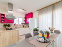 Fin enmannsbolig "Villa May", med 2 etasjer, bygget i 2018. I det lille tettstedet Červari 3 km fra sentrum av Tinjan, 14 km fra sentrum av Pazin, 16 km fra sentrum av Poreč, i en roligt, solrikt posisjon, 16 km fra sjøen. Privat: tomt 1'900 m2 (inngjerdet), plen 1'000 m2 trær, svømmebasseng kantete (9 x 4 m, 37 m2, dybde 140 cm, Sesongåpent: 03.Apr. - 09.Okt.) med innebygde trapper. Utendørs dusj, bordtennis, volleyball, terrasse (50 m2), hagemøbler, grill, Underholdning av bassenget av eieren/gartneren. I hbrukt: internetilkobbling, vaskemaskin. Tilgang med bil hele veien til hbrukt (50 m naturvei). Parkering (for 4 biler) på tomten. Butikk 3 km, supermarked 14 km, restaurant 2 km, småstenstrand 16 km, betonglagt strand 16 km. Turstier fra hbrukt 200 m. Attraksjoner i nærheten: Adventure park 5 km. Vennligst merk: flyplass 52 km av hbrukt. Regionen er et populært reisemål for en morsom seilopplevelse.Interior