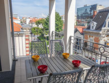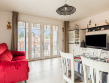 3 rom leilighet 63 m2 i 3rd etasje. Komfortabelt og vakkert møbler: stue/spisestue med, TV (flatskjerms TV). Utgang til terrassen. 1 rom med, 1 dobbeltseng (1 x 160 cm, lengde 200 cm). 1 rom med 2 senger (80 cm lengde 190 cm). Utgang til balkongen. Åpent kjøkken (ovn, oppvaskmaskin, 3 induksjonskomfyr, brødrister, vannkoker, mikrobølgeovn, frys, elektrisk kaffemaskin, Internet(Nespresso), ekstra). Bad, sep. WC, dobbel servant. Gassoppvarming. Liten balkong, terrasse 8 m2, beliggenhet mot sør. Liggestoler (2). Fasiliteter: vaskemaskin, strykejern, hårføner. Internett (trådløs LAN [WLAN], gratis). Parkeringsplass plass nr 10 (overdekt, 1 Bil). Vennligst merk: leilighet vendt mot veien. Røykvarsler. Residence. En balkong er tilgjengelig. Den har en overbygd parkeringsplass.- Kjennetegn ved boligen