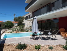 "Viva-by the Sea-Garden & Terraces", 3 rom leilighet 78 m2, på bakkeplan. Moderne møbler: stue/spisestue med, TV (flatskjerms TV), air-conditioning og vifte. Utgang til terrassen. 1 rom med, 1 dobbeltseng (180 cm, lengde 200 cm), dusj/WC, dobbel servant og air-conditioning. Utgang til terrassen. 1 rom med 2 senger (90 cm lengde 200 cm), dusj/WC, dobbel servant og air-conditioning. Utgang til terrassen. Åpent kjøkken (stekeovn, oppvaskmaskin, 4 keramiske kokeplater, brødrister, vannkoker, frys, elektrisk kaffemaskin). Airconditioning, varmluftsoppvarming. Terrasse 30 m2, dekt. Terrassemøbler, grill. Fasiliteter: myggnett. Internett (trådløs LAN [WLAN], gratis). Vennligst merk: røykfritt hus. Max kjæledyr/små hunder tillatt 2 kjæledyr/små hunder tillatt. Egen inngang. Privat: svømmebasseng (5 x 3 m, dybde 90 cm, 15.05.-16.09.) med innebygde trapper og bassengrensningssystem med saltelektrolyse. Egnet for grilling. Den har en parkeringsplass. Et basseng er tilgjengelig.- fasiliteter