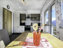 "Panorama Apart", 3 rom leilighet 67 m2, på bakkeplan. Meget vakkert møbler: inngang. 1 rom med, 1 x 2 køysenger, 1 dobbeltseng og satelit-TV (flatskjerms TV). 1 rom med 2 senger. Kjøkken/stue (stekeovn, oppvaskmaskin, 4 keramiske kokeplater, brødrister, vannkoker, mikrobølgeovn, elektrisk kaffemaskin) med, spisebord. Utgang til terrassen. Dusj/WC, sep. WC. Gulvvarme. Terrassemøbler, grill. Vennligst merk: kjøleskap uten frys, røykfri bolig. Det er en røykfri eiendom, vennligst hold deg til den. En barneseng er tilgjengelig. Det er en komfyr.- fasiliteter