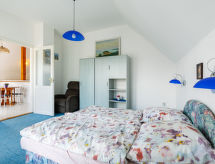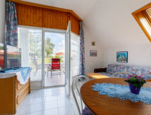 "Anthony 2", 3-pokojowe mieszkanie 60 m2, na poddaszu. Częściowo mansardowe, wygodne umeblowanie: hol wejściowy z stołem, kącikiem kuchennym i TV (satelitarna). Wyjście na balkon. 1 pokój z 3 łóżkami. 1 pokój z 1 łóżkiem dwuosobowym. Wyjście na balkon. Prysznic/WC. Balkon. Meble ogrodowe, grill (przenośny). Miejsce parkingowe. MA19010144- udogodnienia