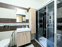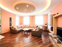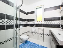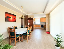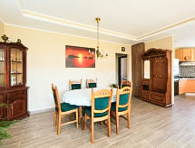 4-pokojowe mieszkanie 110 m2, na parterze. Gustowne i przytulne umeblowanie: duży salon/jadalnia z TV (kablowa). Wyjście na taras. 1 pokój z 1 łóżkiem podwójnym (200 cm, o długości 200 cm), prysznicem/WC. 1 pokój z 1 łóżkiem podwójnym (200 cm, o długości 200 cm), TV. 1 pokój z 2 łóżkami. Otwarta kuchnia (4 palniki, piekarnik, zmywarka do naczyń). Prysznic/WC. Duży taras 30 m2. Grill (przenośny). Miejsce parkingowe (2 samochody).- udogodnienia