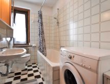 4-pokojowe mieszkanie 75 m2 na 2. piętrze. Jasne, proste i z dużą ilością drewna umeblowanie: salon/sypialnia z 1 dwuosobową kanapą (160 cm), TV (satelitarna). Wyjście na balkon. 1 pokój z 1 łóżkiem podwójnym (160 cm). Wyjście na balkon. 1 pokój z 2 łóżkami (80 cm). 1 pokój z 1 x 2 łóżkami piętrowymi (80 cm). Kuchnia (piekarnik, zmywarka do naczyń, 4 palniki, czajnik elektryczny, kuchenka mikrofalowa, ekspres do kawy) z stołem. Wyjście na balkon. Łazienka/WC, oddzielne WC. Ogrzewanie olejowe. Wykładzina dywanowa. Duży balkon. Leżaki. Do dyspozycji: pralka, łóżko dla dziecka. Internet (bezprzewodowy LAN [WLAN], gratis). 014037-CNI-00361- udogodnienia