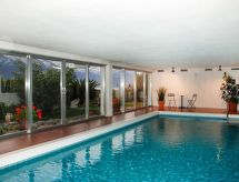 "Casa Pace App. 1 Stock", 3-pokojowe mieszkanie 80 m2 na 1. piętrze. Przestronne i jasne, wygodne i przytulne umeblowanie: otwarty duży salon/jadalnia z oknem panoramicznym z stołem, TV (kablowa) i TV z kanałami międzynarodowymi (TV z płaskim ekranem). Wyjście na balkon. 1 pokój 2-osobowy z 1 łóżkiem podwójnym (2 x 90 cm, o długości 200 cm). Wyjście na balkon. 1 pokój z 2 łóżkami (100 cm, o długości 200 cm). Wyjście na balkon. Mała kuchnia (piekarnik, zmywarka do naczyń, 4 palniki – kuchenka z płytą ceramiczną, toster, czajnik elektryczny, ekspres do kawy, naboje do ekspresu do kawy (Nespresso) extra). Prysznic/WC, oddzielne WC. Duży balkon, od południa. Meble balkonowe, leżaki (2). Ładny widok panoramiczny na jezioro, na góry, na okolicę i na miejscowość. Do dyspozycji: żelazko, krzesełko dla dziecka, łóżko dla dziecka do 2 lat (extra), suszarka do włosów. Internet (bezprzewodowy LAN [WLAN], gratis). Miejsce parkingowe numer INTERHOME (kryte) obok domu, wysokość 220 cm, szerokość 255 cm. Informacja dodatkowa: mieszkanie dla osób niepalących. Max. 1 zwierzak/pies. Basen kryty otwarty jest również zimą, temperatura wody 18° w zimie.- udogodnienia