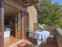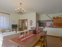 "Casetta", 3-pokojowe mieszkanie 90 m2 na 1. piętrze. Ładne i przytulne umeblowanie: salon/jadalnia z kominkiem (tylko dekoracja), stołem i TV. Wyjście na taras. 1 pokój z 1 łóżkiem dwuosobowym (160 cm). 1 pokój z 2 łóżkami (80 cm). Kącik kuchenny (piekarnik, zmywarka do naczyń, 4 palniki, kuchenka mikrofalowa, zamrażarka, ekspres do kawy). Prysznic/WC. Ogrzewanie gazowe. Taras 12 m2, patio ogrodowe. Meble ogrodowe. Ładny widok na okolicę i na las. Do dyspozycji: krzesełko dla dziecka, łóżko dla dziecka. Internet (bezprzewodowy LAN [WLAN], gratis). Informacja dodatkowa: mieszkanie dla osób niepalących. Max. 1 mały zwierzak/pies. Niezależne wejście.- udogodnienia
