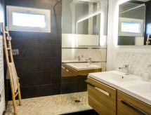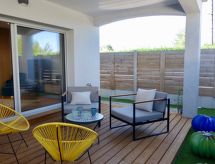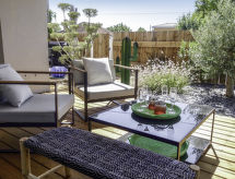 3-pokojowe mieszkanie 100 m2, na parterze. Ładne i gustowne umeblowanie: salon/jadalnia z TV (TV z płaskim ekranem). Wyjście na taras. 1 pokój z 2 x 2 łóżkami piętrowymi (90 cm, o długości 190 cm). 1 pokój z 1 łóżkiem dwuosobowym (1 x 180 cm, o długości 200 cm), prysznicem, podwójną umywalką i TV (TV z płaskim ekranem). Wyjście na taras. Otwarta kuchnia (piekarnik, zmywarka do naczyń, 4 palniki – kuchenka z płytą ceramiczną, toster, czajnik elektryczny, kuchenka mikrofalowa, zamrażarka, ekspres do kawy, naboje do ekspresu do kawy (Nespresso) extra). Prysznic, oddzielne WC. Ogrzewanie elektryczne. Duży taras 40 m2, od południa, duży taras 15 m2, od północy. Meble ogrodowe, grill, leżaki. Do dyspozycji: pralka, suszarka, żelazko, łóżko dla dziecka, suszarka do włosów. Internet (bezprzewodowy LAN [WLAN], gratis). Miejsce parkingowe numer 7,8 (2 samochody). Informacja dodatkowa: 1 zwierzak/pies. Czujnik dymu.- udogodnienia