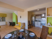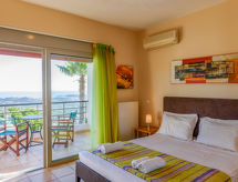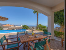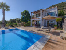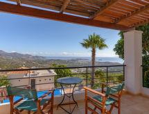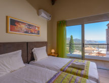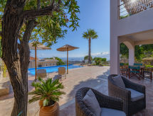 "Dreamview", 3-pokojowa willa 117 m2 na 2 poziomach. Jasne, bardzo wygodne umeblowanie: duży salon/jadalnia z stołem, oddzielnym WC i TV (satelitarna) (TV z płaskim ekranem), klimatyzacją. Wyjście na taras, na basen. Otwarta kuchnia (piekarnik, 4 palniki – kuchenka z płytą ceramiczną, toster, czajnik elektryczny, kuchenka mikrofalowa, ekspres do kawy). Na piętrze: (schody bez poręczy) 1 pokój 2-osobowy z 2 łóżkami i klimatyzacją. Wyjście na balkon. 1 pokój 2-osobowy z 1 łóżkiem podwójnym i klimatyzacją. Wyjście na balkon. Prysznic/WC. 2 balkony. Leżaki, loggia, miejsce do siedzenia. Bardzo ładny widok panoramiczny na morze, na góry, na basen i na miasto. Do dyspozycji: pralka, żelazko, suszarka do włosów. Internet (bezprzewodowy LAN [WLAN], gratis). Informacja dodatkowa: czujnik dymu, gaśnica. 1040K91003009601- udogodnienia