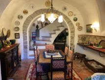 6-pokojowy dom 100 m2 na 3 poziomach. Antyczne i przytulne umeblowanie: salon z kominkiem i stołem. Wyjście do ogródka. Kuchnia (5 palników, piekarnik, zamrażarka). Wyjście do ogrodu. Na piętrze: salon z kominkiem. Wyjście na taras. 1 pokój z 2 łóżkami. Salon. Łazienka/bidet/WC. 2 piętro: 1 pokój z oknem panoramicznym z 2 łóżkami. 1 pokój 2-osobowy z oknem panoramicznym. Prysznic/bidet/WC. Taras 35 m2. Meble ogrodowe. Ładny widok panoramiczny na góry, na dolinę i na ogród. Miejsce parkingowe.- Charakterystyka zakwaterowania