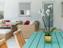 3-pokojowe mieszkanie 90 m2, na parterze. Duży salon/jadalnia z 1 kanapą, TV (satelitarna) i klimatyzacją. Wyjście na taras. 1 pokój z 1 łóżkiem podwójnym. Wyjście na loggię. 1 pokój z 2 łóżkami. Otwarta kuchnia (2 palniki, zmywarka do naczyń, kuchenka mikrofalowa). Prysznic/bidet/WC. Klimatyzacja (extra). Duży taras. Meble ogrodowe.- udogodnienia