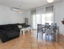 "Granada", 4-pokojowy dom 90 m2. Jasne, bardzo praktyczne i nowoczesne umeblowanie: salon/jadalnia z stołem i TV cyfrowa. Wyjście na taras, na basen. 2 pokoje z 2 łóżkami bliźniaczymi, każdy pokój z 1 łóżkiem dwuosobowym (135 cm, o długości 190 cm). 1 pokój z 2 łóżkami (90 cm, o długości 190 cm). Kuchnia (4 palniki – kuchenka z płytą ceramiczną, toster, czajnik elektryczny, kuchenka mikrofalowa, zamrażarka, ekspres do kawy). Prysznic/WC. Brak możliwości ogrzewania. Duży taras. Meble ogrodowe, grill, leżaki. Widok na miejscowość. Do dyspozycji: pralka, żelazko, krzesełko dla dziecka, łóżko dla dziecka do 2 lat, suszarka do włosów. Internet (bezprzewodowy LAN [WLAN], gratis). Informacja dodatkowa: TV tylko ES. HUTG052970- udogodnienia