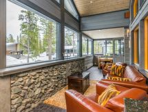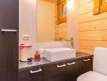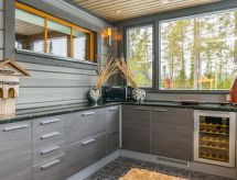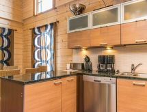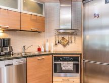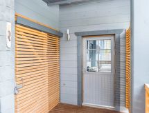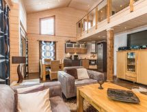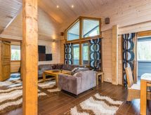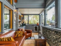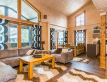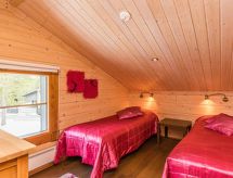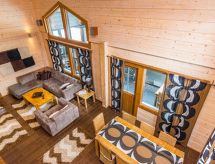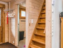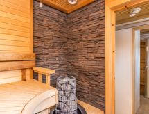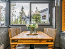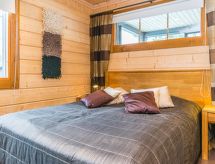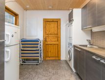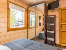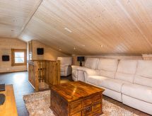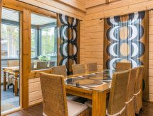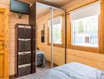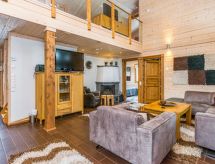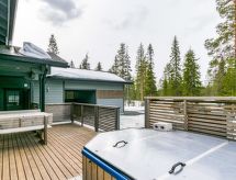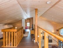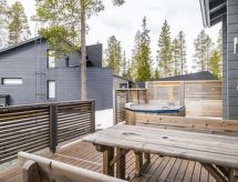 25 km north from Kuusamo, Ruka village (Western Ruka) 3,2 km. Semidetached log house, built in 2009, bedroom 1 (downstairs): double bed, bedroom 2 (downstairs): double bed, bedroom 3 (loft): 2 beds, bedroom 4 (loft): 2 beds, combined kitchen/livingroom, electric sauna. Downstairs 103 m², loft 44.5 m² + large utility room 11.5 m². New cottage area between Ruka fell and highway nr 5. Nearest ski lift Talvijärvi, nearest restaurant Royal Ruka. To the skibus stop 400 m. Grocery store 1.4 km. Internet-connection (wireless 4 G) Additional information: Locked warehouse. Good unit for business groups. Note: hot tub and gas fireplace on terrace are not in use. Other distances: Oulanka National Park/Pieni Karhunkierros -trail 22 km. Reservations start at 16.00 and end at 12.00 (also in weekend bookings).- udogodnienia