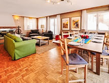 6-pokojowe mieszkanie 200 m2 na 2 poziomach na 1. piętrze, od południowego-zachodu. Przestronne, wygodne i gustowne umeblowanie: salon/jadalnia z kominkiem, stołem, TV, sprzętem stereo i DVD. Wyjście na balkon. 1 pokój z rozsuwanymi drzwiami z 1 x 2 łóżkami piętrowymi (90 cm, o długości 200 cm), 1 łóżkiem podwójnym (160 cm, o długości 200 cm), łazienką/bidetem/WC. Otwarta kuchnia (piekarnik, zmywarka do naczyń, 4 palniki – kuchenka z płytą ceramiczną, toster, czajnik elektryczny, kuchenka mikrofalowa, zamrażarka, ekspres do kawy, grill typu Raclette, zestaw do fondue (mięsny, serowy)). Oddzielne WC. Niski parter: (kręcone schody) 1 pokój, bez okna z 1 x 2 łóżkami piętrowymi (90 cm, o długości 200 cm). 1 pokój z 1 łóżkiem podwójnym (2 x 90 cm, o długości 200 cm). 1 pokój z 1 łóżkiem podwójnym (2 x 90 cm, o długości 200 cm). 1 pokój z 1 łóżkiem podwójnym (2 x 90 cm, o długości 200 cm). Łazienka/bidet/WC. Duży balkon, od południa i od zachodu. Meble balkonowe. Widok Matterhorn. Do dyspozycji: suszarka do włosów. Internet (bezprzewodowy LAN [WLAN], gratis). Informacja dodatkowa: mieszkanie dla osób niepalących.- udogodnienia