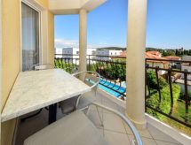 3-pokojowe mieszkanie 45 m2 na 2. piętrze, od południowego-zachodu. Salon/jadalnia z TV (satelitarna), DVD i klimatyzacją. Wyjście na taras. 2 pokoje, każdy pokój z 1 łóżkiem dwuosobowym (160 cm, o długości 200 cm). Otwarta kuchnia (4 palniki, piekarnik, kuchenka mikrofalowa, zamrażarka). Prysznic/WC. Taras 12 m2 (zadaszony). Meble ogrodowe. Częściowy widok na morze i na miejscowość. Do dyspozycji: pralka. Internet (bezprzewodowy LAN [WLAN], gratis).- udogodnienia