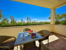 2-pokojowe mieszkanie 46 m2, na podwyższonym parterze, od południowego-zachodu. Salon/jadalnia 20 m2 z 1 dwuosobową kanapą, TV (satelitarna) i klimatyzacją. Wyjście na taras. 1 pokój z 1 łóżkiem podwójnym (2 x 90 cm, o długości 200 cm). Otwarta kuchnia (2 palniki, zmywarka do naczyń, kuchenka mikrofalowa). Łazienka/WC. Taras 11 m2. Meble ogrodowe. Częściowy widok na morze i na basen. Do dyspozycji: żelazko, suszarka do włosów. Internet (bezprzewodowy LAN [WLAN], gratis).- udogodnienia