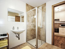 "Matilda", 2-pokojowe mieszkanie 50 m2, niski parter. Nowoczesne i przytulne umeblowanie: 1 pokój z 1 łóżkiem dwuosobowym (140 cm), 1 łóżkiem podwójnym. Salon/sypialnia z 1 łóżkiem wysuwanym (2 os.), TV (satelitarna) (TV z płaskim ekranem). Otwarta kuchnia (piekarnik, zmywarka do naczyń, 4 palniki – kuchenka z płytą ceramiczną, kuchenka mikrofalowa, ekspres do kawy, naboje do ekspresu do kawy (Tchibo)) z stołem. Prysznic/WC. Do dyspozycji: Internet (bezprzewodowy LAN [WLAN], gratis). Informacja dodatkowa: mieszkanie dla osób niepalących. Czujnik dymu. Ten mały i ładny apartament położony jest w pobliżu znanych regionów narciarskich. Na miejscu klient ma do wyboru różne możliwości spania.- udogodnienia