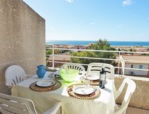 3-pokojowy dom szeregowy 42 m2 na 2 poziomach. Salon/jadalnia z 1 dwuosobową kanapą i TV. Wyjście na balkon. Kącik kuchenny (2 palniki, piekarnik, kuchenka mikrofalowa). Oddzielne WC. Niski parter: 1 pokój z 2 łóżkami. 1 pokój z 1 łóżkiem dwuosobowym (140 cm). Prysznic/WC. Ogrzewanie elektryczne. Balkon 7 m2, od południa. Meble ogrodowe. Widok panoramiczny na morze. Do dyspozycji: pralka. Internet (bezprzewodowy LAN [WLAN], extra). Miejsce parkingowe. Informacja dodatkowa: Max. 1 zwierzak/pies. TV tylko FR. Czujnik dymu. Wejście do domu po 16 schodach.- Charakterystyka zakwaterowania