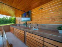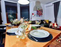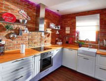 Ładny dom jednorodzinny "Mia", 2 piętrowy. W małej wiosce Spahići 7 km od centrum Bosiljevo, 80 km od centrum Zagreb, 95 km od centrum Opatija, spokojne, słoneczne położenie, 200 m od rzeki, otoczony zielenią. Do indywidualnego użytku: działka 1'600 m2 (ogrodzona), trawnik 800 m2, krzewy, basen prostokątny (7 x 3 m, głębokość 145 cm, dostępność sezonowa: 11.Maj. - 28.Wrz.) z wbudowanymi schodami. Prysznic na zewnątrz, taras (37 m2), meble ogrodowe, grill, plac zabaw (zjeżdżalnia, huśtawka). W domu: dostęp do internetu, sauna, wanna z hydromasażem, alarm, pralka. Miejsca parkingowe (dla 4 samochodów) obok domu na terenie. Stacja ładowania pojazdów elektrycznych. Sklep wielobranżowy 1.5 km, restauracja 3 km. Atrakcje w pobliżu domu: NP Risnjak 70 km. Znane jeziora w okolicy, łatwo dostępne: Plitvička jezera 90 km. Informacja dodatkowa: odpowiedni dla rodzin. Odległość do przejścia granicznego ze Słowenią, 2,5 km. Szlafroki i klapki (wliczone w cenę).Interior