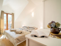 2-pokojowe mieszkanie 44 m2 na 1. piętrze. Salon/jadalnia z 1 dwuosobową kanapą (150 cm o długości 200 cm), TV (satelitarna) (TV z płaskim ekranem). 1 mansardowy pokój, wysokość pomieszczenia 113 - 270 cm z 1 łóżkiem dwuosobowym (160 cm, o długości 200 cm). Otwarta kuchnia (piekarnik, 2 palniki – kuchenka z płytą ceramiczną, zamrażarka). Prysznic/WC. Ogrzewanie (extra). Do dyspozycji: Internet (bezprzewodowy LAN [WLAN], gratis). 1 zwierzak/pies.- udogodnienia