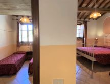"Orso", 3-pokojowy dom bliźniaczy 46 m2. Proste i rustykalne umeblowanie: salon/sypialnia z 1 kanapą (80 cm), stołem i TV (satelitarna). 1 pokój z 1 łóżkiem podwójnym (160 cm). 1 pokój z 2 łóżkami (80 cm). Otwarta kuchnia (4 palniki, kuchenka mikrofalowa, ekspres do kawy) z kominkiem (tylko dekoracja). Łazienka/WC. Klimatyzacja. Patio ogrodowe. Grill. Ładny widok panoramiczny na góry i na dolinę. Do dyspozycji: moskitiery, krzesełko dla dziecka, łóżko dla dziecka do 2 lat. Informacja dodatkowa: niezależne wejście.- udogodnienia