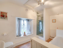 3-pokojowy dom typu „cottage” na 2 poziomach. Przestronne i jasne, wygodne i gustowne umeblowanie: otwarty salon z TV, TV z płaskim ekranem, DVD i piecem opalanym drewnem. Otwarta kuchnia (4 palniki, piekarnik, zmywarka do naczyń, kuchenka mikrofalowa, zamrażarka) z dużym stołem, radiem. Oddzielne WC. Na piętrze: 1 pokój 2-osobowy z 1 łóżkiem podwójnym. 1 pokój z 2 łóżkami. Łazienka/prysznic/WC. Ogrzewanie. Meble ogrodowe. Ładny widok na ogród. Do dyspozycji: pralka. Informacja dodatkowa: dom dla niepalących. 1 zwierzak/pies.- Charakterystyka zakwaterowania