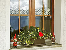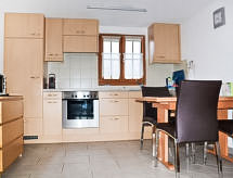 "Wohnung 4", 3-pokojowe mieszkanie 55 m2 na 1. piętrze, od południa. Wygodne i przytulne umeblowanie: salon z TV (satelitarna) (TV z płaskim ekranem), radiem i odtwarzaczem CD. Wyjście na balkon. 1 pokój z 1 łóżkiem podwójnym. 1 pokój z 2 łóżkami. Otwarta kuchnia (piekarnik, zmywarka do naczyń, 4 palniki – kuchenka z płytą ceramiczną, kuchenka mikrofalowa, ekspres do kawy, naboje do ekspresu do kawy (Nespresso) extra) z dużym stołem. Prysznic/WC. Ogrzewanie olejowe. Balkon 12 m2. Meble ogrodowe, leżaki (2), schowek. Bardzo ładny widok na góry, na dolinę, na okolicę i na miejscowość. Do dyspozycji: suszarka do włosów. Internet (bezprzewodowy LAN [WLAN], gratis). Informacja dodatkowa: mieszkanie dla osób niepalących. Garderoba.- udogodnienia