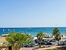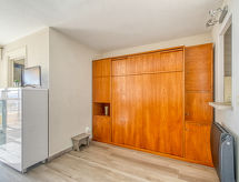 1-rums-studio 30 m2 på 3. våningen. Vardags-/matrum med 1 fransk skåpsäng (1 x 140 cm, längd 190 cm), TV. Sovalkov med 1 x 2 våningssängar (80 cm, längd 190 cm). Öppet kök (diskmaskin, 2 Induktionshäll, brödrost, vattenkokare, frys, elektrisk kaffemaskin, kombinerad mikrovågsugn). Dusch, sep. Toalett. Terrass 8 m2. Terrassmöbler, vilstolar (2). Utsikt på havet. Till förfogande: tvättmaskin, hårtork. Internet (Trådlös LAN [WLAN] , extra). Parkeringsplats nr 56 (täckt), höjd 190 cm, bredd 235 cm. Notera: rökfri lägenhet, parkeringsplats endast för små bilar. Brandvarnare.- Kännetecken för boendet
