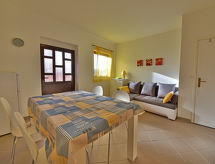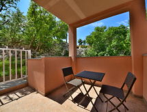 2-rums-lägenhet 40 m2 på 1. våningen. Vardags-/matrum med 1 bäddsoffa för 2 personer (150 cm, längd 200 cm), sat-TV (flatscreen TV), luftkonditionering. Utgång till terrassen. 1 rum med 1 fransk säng (180 cm, längd 200 cm). Utgång till balkongen. Öppet kök (ugn, 4 kokplattor - glaskeramikhäll, frys, elektrisk kaffemaskin). Dusch/toalett. Luftkonditionering (extra). Balkong 6 m2, terrass 6 m2, täckt. Terrassmöbler. Utsikt på havet. Till förfogande: Internet (Trådlös LAN [WLAN] , gratis).- Utrustning
