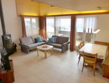 "Rehli", 3-rums-lägenhet i två våningar 70 m2 med 2 våningar på 2. våningen, sydostläge. Rymlig och ljus, komfortabelt och mysigt inredd: öppet vardags-/matrum med panoramafönster med braskamin, matvrå och kabel-TV (flatscreen TV), radio och stereoanläggning. Utgång till balkongen. 1 litet rum med 2 sängar (90 cm, längd 200 cm). Kök (ugn, diskmaskin, 4 kokplattor - glaskeramikhäll, brödrost, vattenkokare, mikrovågsugn, elektrisk kaffemaskin, raclettegrill, fondueset (ost )) med matbord. Badkar/dusch/toalett. Övre våning: (brant trappa) öppet galleri. 1 rum med 1 dubbelsäng (2 x 90 cm, längd 200 cm). Stor balkong, sydläge. Balkongmöbler, vilstolar. Härlig panoramautsikt på sjön, bergen och landskapet. Till förfogande: strykjärn, barnsäng för barn under 2 år (extra), hårtork, ved (gratis). Internet (Trådlös LAN [WLAN] , gratis). Garage nr 18 på tomten. Notera: lämpligt för barnfamiljer. Rökfri lägenhet. Ingen hiss.- Kännetecken för boendet