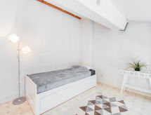 3-rums-lägenhet 46 m2 med 2 våningar på 2. våningen. Praktiskt inredd: vardags-/matrum med TV (flatscreen TV). Utgång till loggian. 1 rum med 1 fransk säng (1 x 160 cm, längd 200 cm). Kokvrå (diskmaskin, 3 Induktionshäll, mikrovågsugn, frys, elektrisk kaffemaskin, kombinerad mikrovågsugn). Dusch, sep. Toalett. Övre våning: (brant trappa) alkov med 1 x 2 våningssängar (90 cm, längd 190 cm). Till förfogande: Internet (Trådlös LAN [WLAN] , extra). Parkeringsplats nr 48. Notera: brandvarnare, ingen hiss.- Kännetecken för boendet