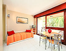 1-rums-lägenhet 33 m2 på 1. våningen, sydläge. Vardags-/matrum med 1 utdragbar säng (2 pers.), TV. Utgång till balkongen. Sovalkov med 1 fransk säng. Kokvrå (4 kokplattor, mikrovågsugn, elektrisk kaffemaskin). Badkar, sep. Toalett. Terrassmöbler. Till förfogande: tvättmaskin, strykjärn. Notera: rökfri lägenhet. Max 1 husdjur/hund tillåtet. Brandvarnare. WIFI not possible. 40296000058SY- Kännetecken för boendet
