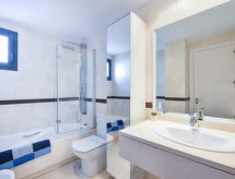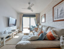 "Alamar", 3-rums-lägenhet 70 m2 på 3. våningen. Komfortabelt inredd: 1 rum med 2 sängar (90 cm, längd 190 cm), badkar/bidé/toalett (privat) digital-TV. Utgång till terrassen. 1 rum med 2 sängar (90 cm, längd 190 cm). Vardags-/matrum med digital-TV. Kök (ugn, diskmaskin, 4 kokplattor - glaskeramikhäll, brödrost, vattenkokare, mikrovågsugn, frys, elektrisk kaffemaskin). Dusch/toalett. Luftkonditionering, varmluftsuppvärmning. Terrass 15 m2 täckt. Terrassmöbler. Begränsad utsikt på havet. Till förfogande: tvättmaskin, strykjärn, hårtork. Internet (Trådlös LAN [WLAN] , gratis). Parkeringsplats nr 18. 1 husdjur/hund tillåtet. VFT/MA/22924- Kännetecken för boendet