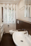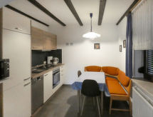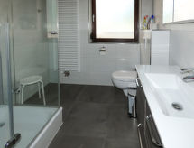 6-rums-hus 150 m2 med 2 våningar. Mysigt och med mycket trä inrett: vardagsrum med sat-TV (flatscreen TV). Utgång till trädgården, till terrassen. 1 rum med 1 dubbelsäng (180 cm, längd 200 cm). 1 rum med 2 sängar (90 cm, längd 200 cm). Öppet kök (4 kokplattor, ugn, diskmaskin, vattenkokare, mikrovågsugn, elektrisk kaffemaskin) med matvrå. Dusch/toalett. Övre våning: (utetrappa) vardagsrum med sat-TV (flatscreen TV). Utgång till balkongen. 1 rum med 1 dubbelsäng (180 cm, längd 200 cm). 1 rum med 2 sängar (90 cm, längd 200 cm). Öppet kök (4 kokplattor, ugn, diskmaskin, brödrost, vattenkokare, elektrisk kaffemaskin, kombinerad mikrovågsugn) med matbord. Dusch/toalett. Gasuppvärmning. Stor balkong 20 m2, sydläge, stor terrass 20 m2 täckt, trädgård 250 m2, gräsmatta 150 m2. Terrassmöbler, balkongmöbler. Vacker utsikt på bergen. Till förfogande: hårtork. Internet (Trådlös LAN [WLAN] , gratis). Parkeringsplats vid huset. Notera: rökfritt hus. Max 1 husdjur/hund tillåtet. Privat entré, privat entré, brandvarnare, brandsläckare. Ingen intern dörr mellan våningarna.- Utrustning